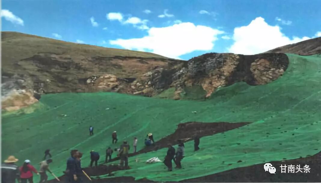 玛曲格萨尔黄金实业有限公司对矿区覆土撒播草籽后并铺盖防尘网